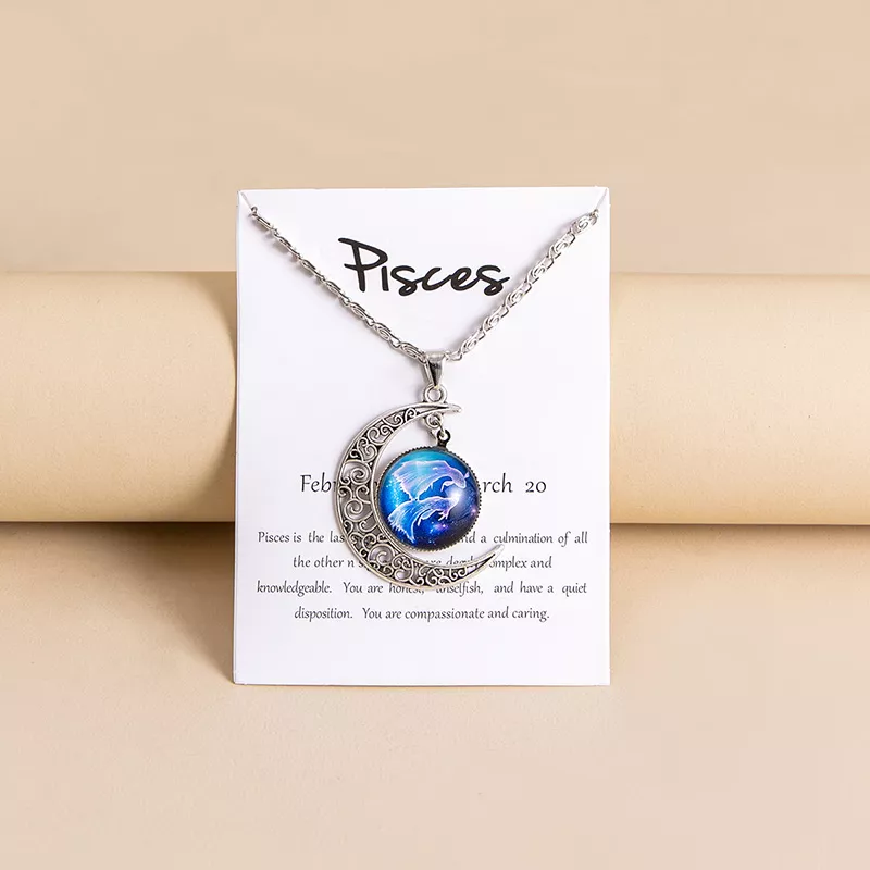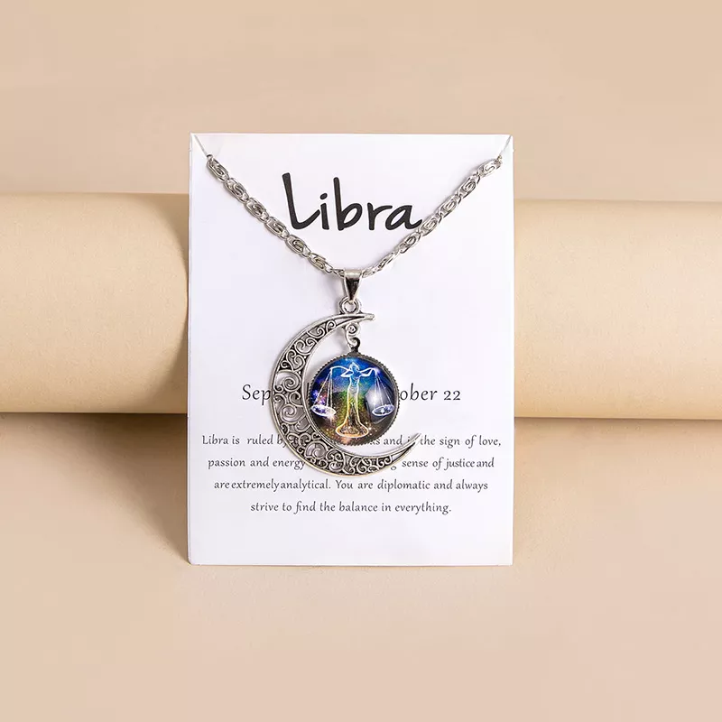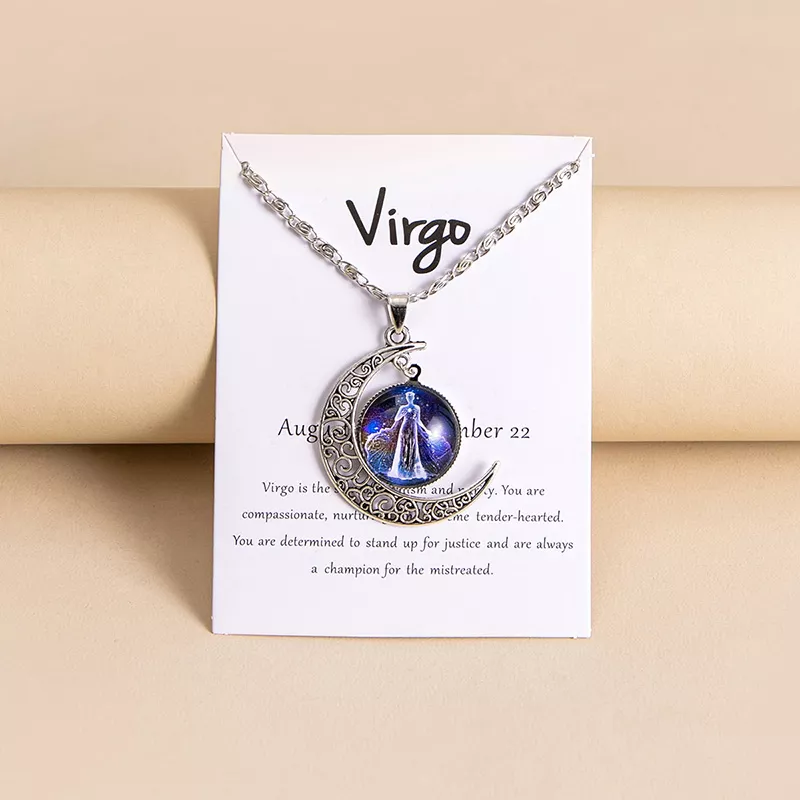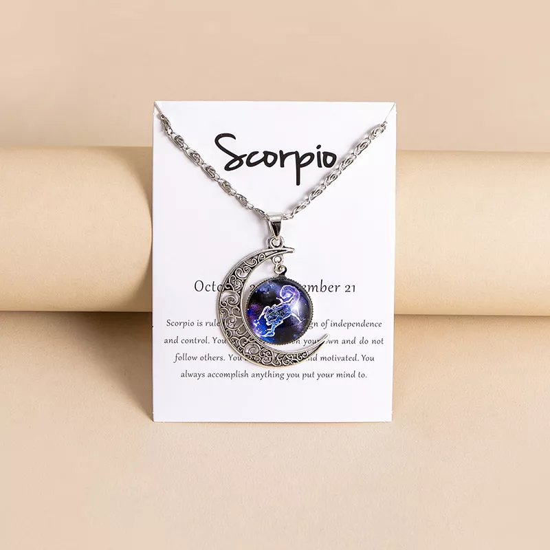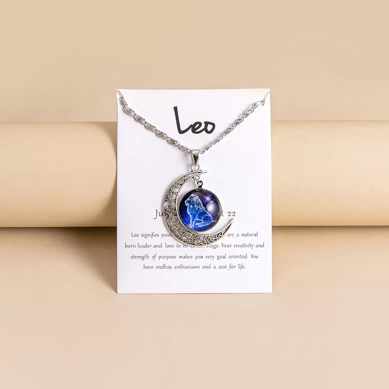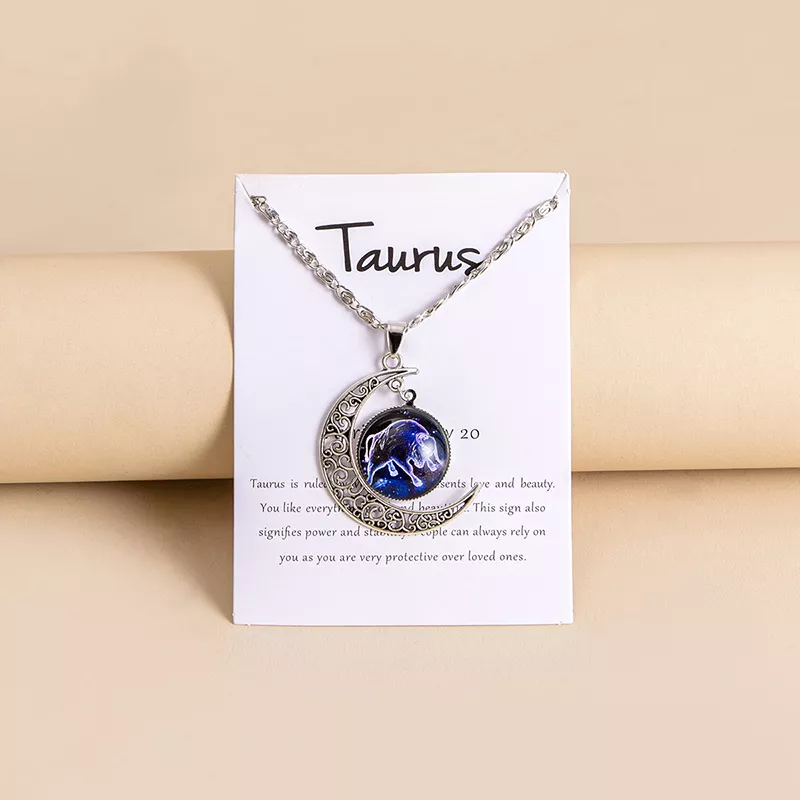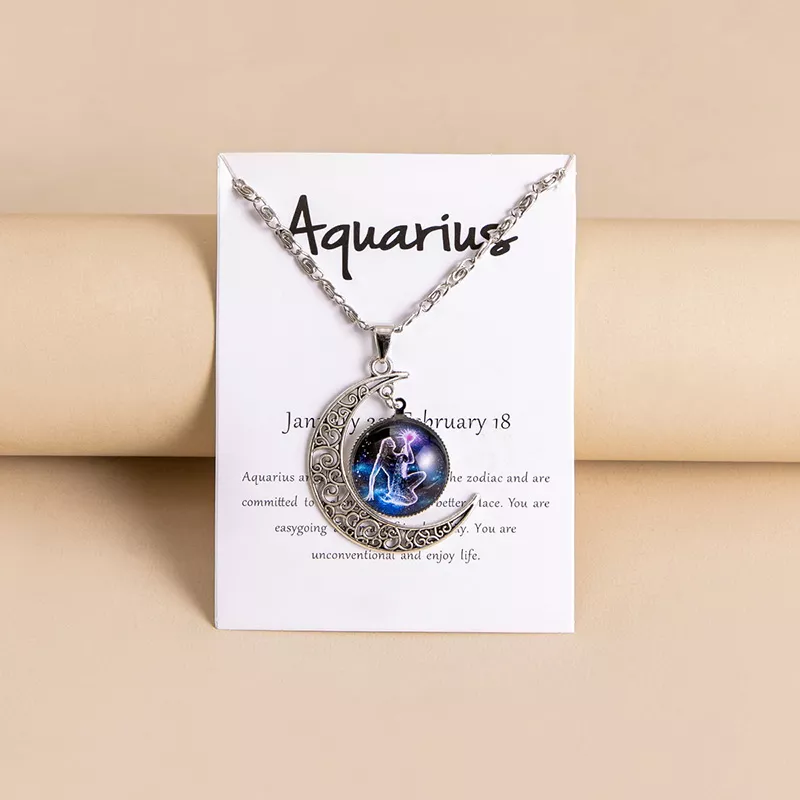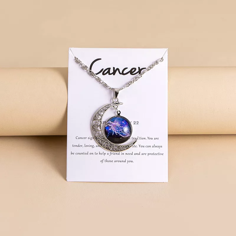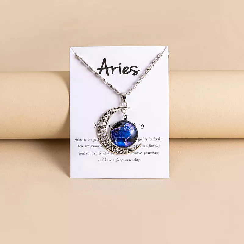 12 Zodiac Sign Moon Pendant Necklace – Galaxy Star Glass Necklace with Gift Card