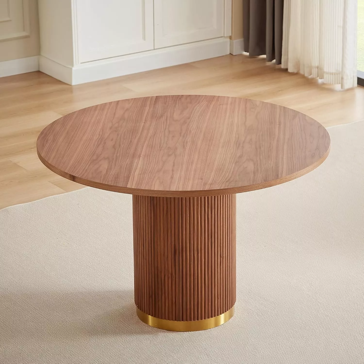 Bring timeless farmhouse beauty and modern design into your home with this 46″ Round Modern Farmhouse Dining Table. Thoughtfully crafted to blend rustic character with sleek detailing, this table creates a cozy yet stylish dining area for family meals, coffee chats, or casual gatherings with friends. The eye-catching ripple base, finished with stainless steel accents, adds a unique sculptural flair, while the warm brown tabletop sets a welcoming tone in your kitchen, dining room, or living space.