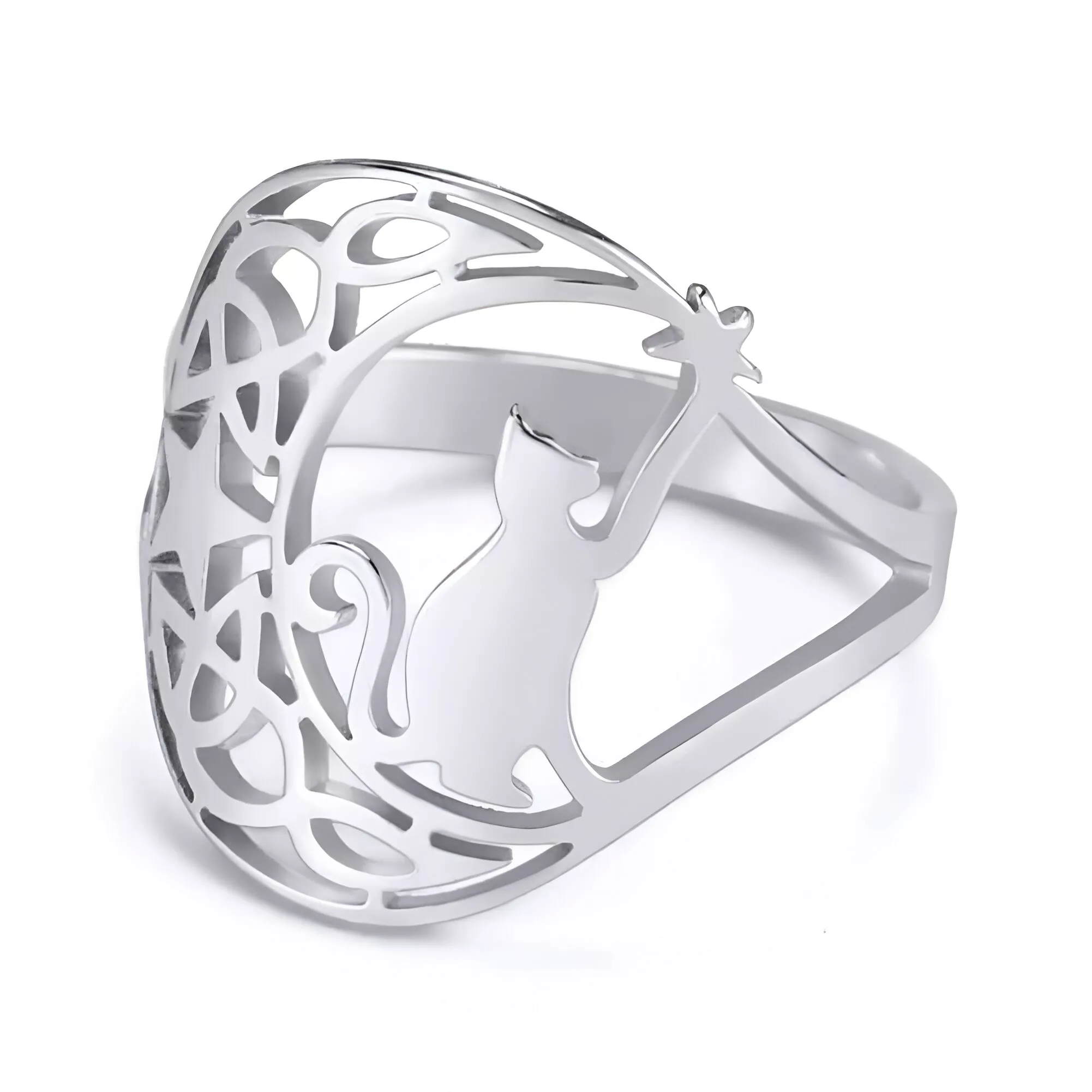 Adjustable Celtic Knot Moon Cat Rings for Women – Stainless Steel Animal Jewelry
