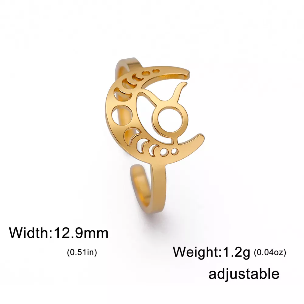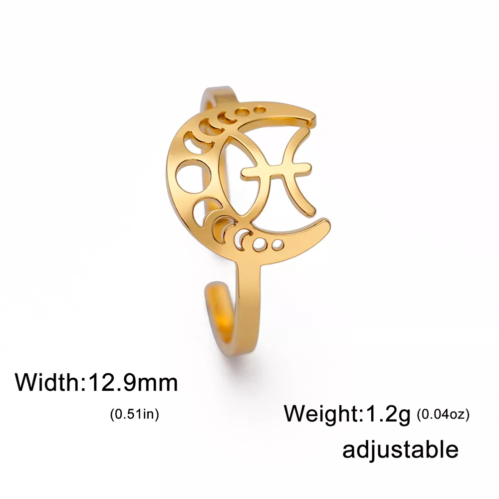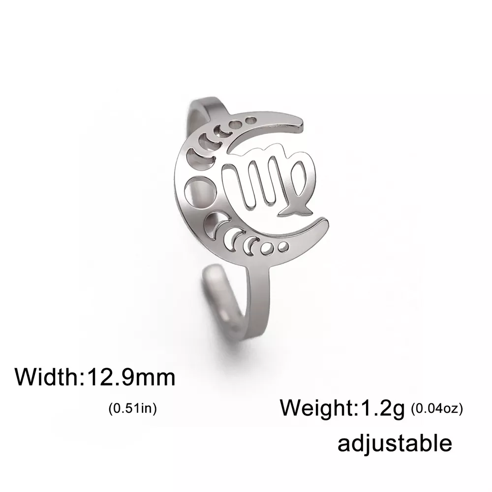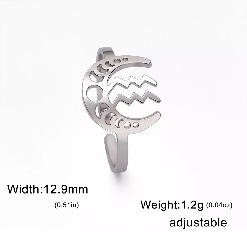 Constellation Crescent Moon Adjustable Ring – 12 Zodiac Signs Stainless Steel Fashion Jewelry