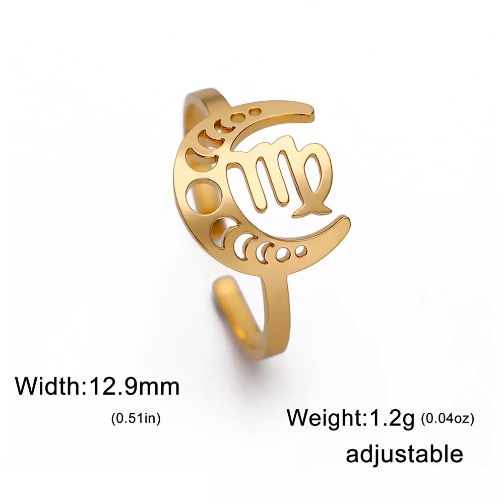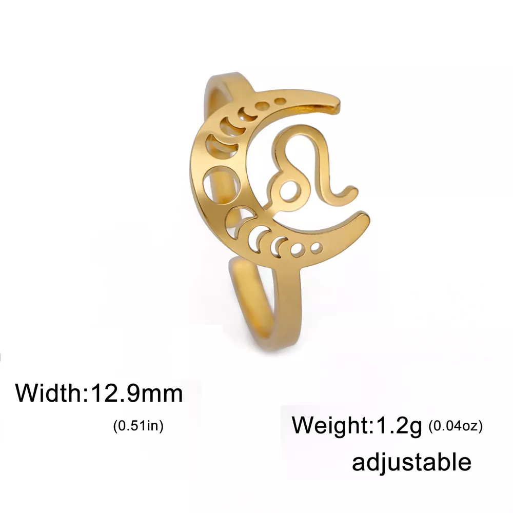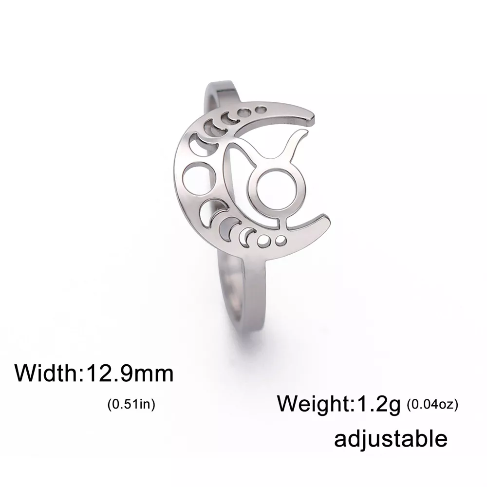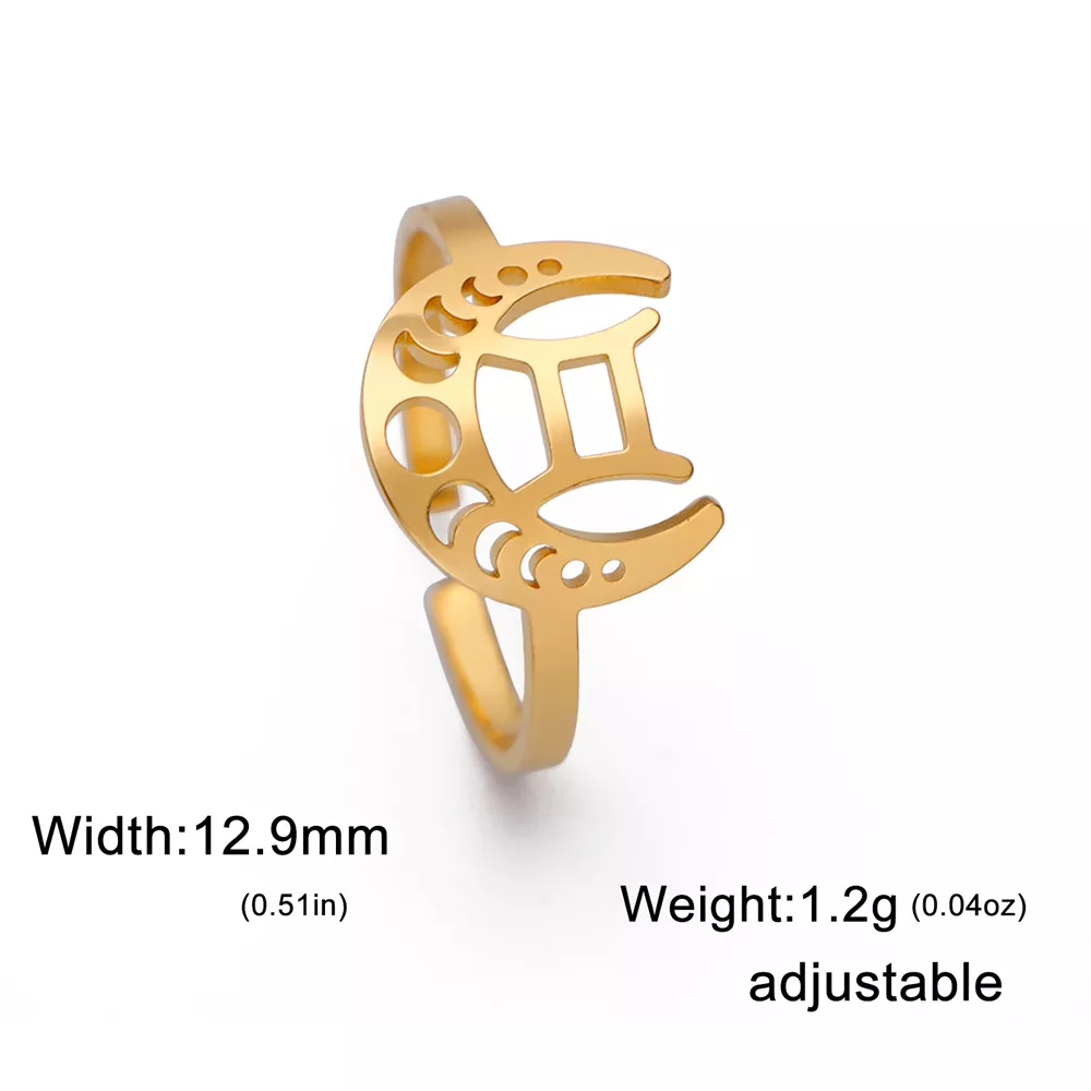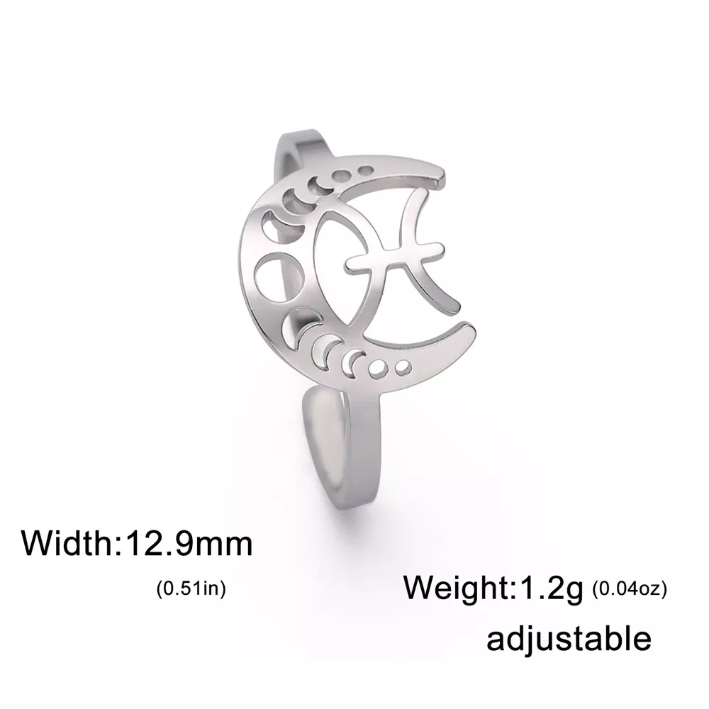 Constellation Crescent Moon Adjustable Ring – 12 Zodiac Signs Stainless Steel Fashion Jewelry