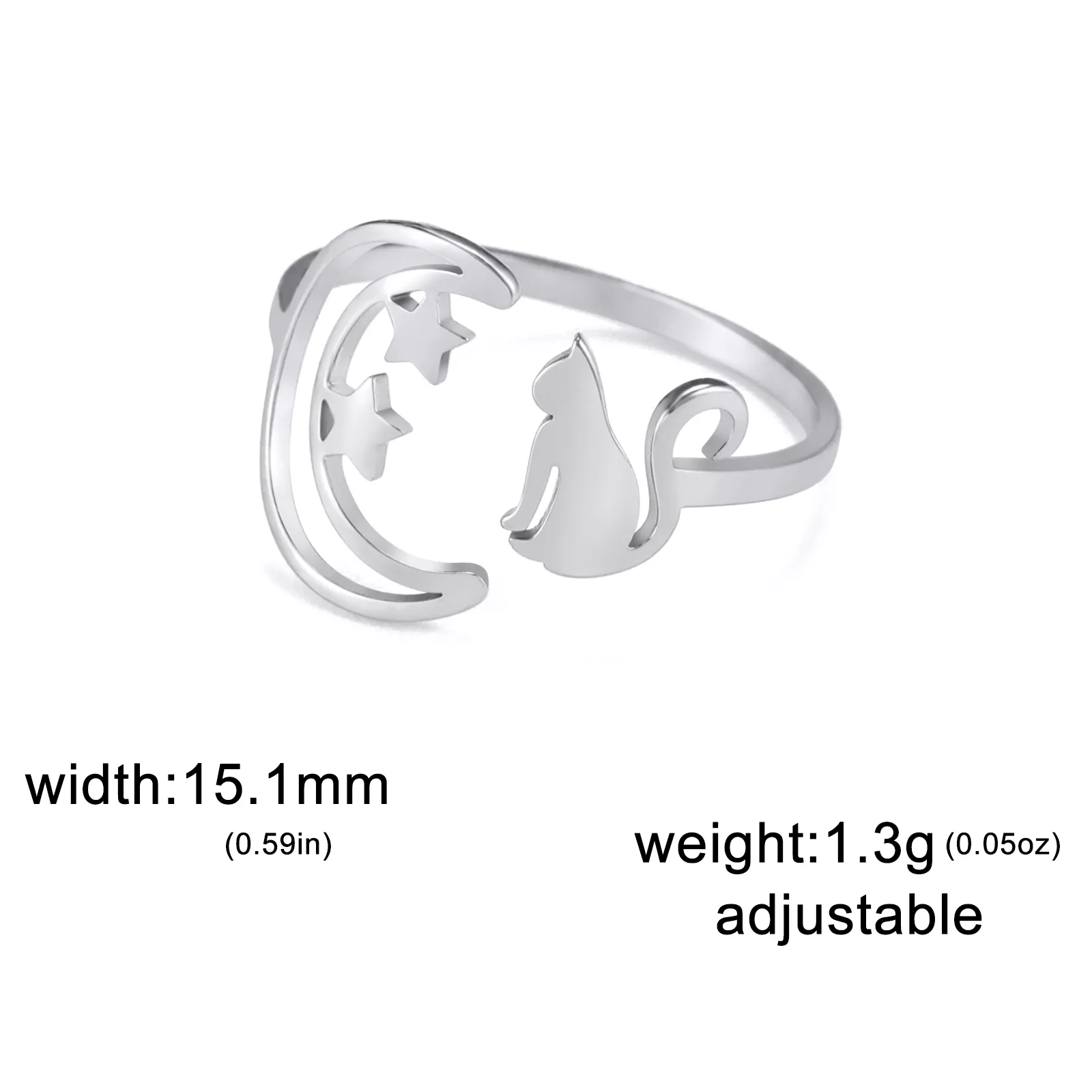 Crescent Moon Star Adjustable Cat Ring for Women – Stainless Steel Gold and Steel Color