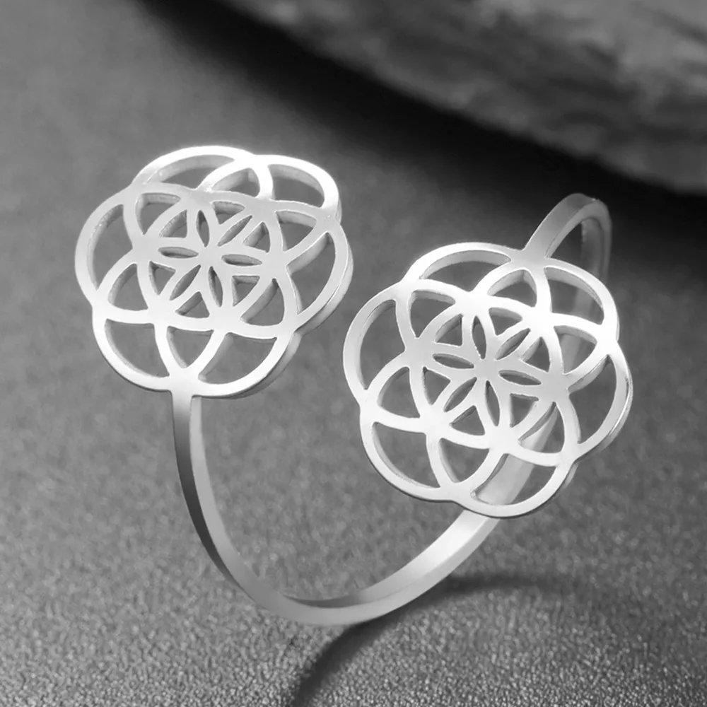 Flower of Life Mandala Adjustable Stainless Steel Ring for Women – Sacred Geometry Yoga Jewelry