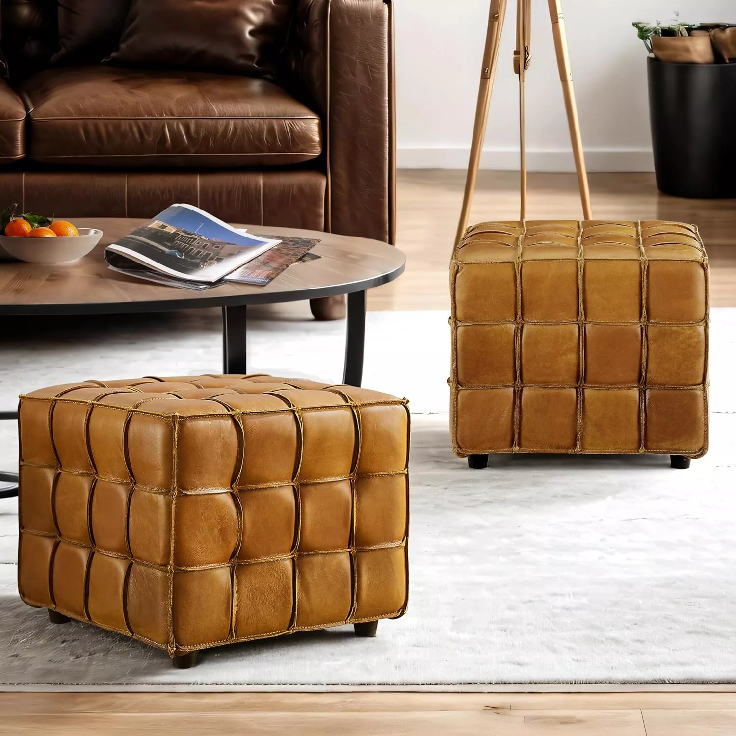 What makes this product special is its winning combination of high-end materials, multifunctional design, and elegant craftsmanship. Unlike other ottomans that look good but lack durability, this piece is made to impress and endure. Add this yellow-brown genuine leather footstool to your home and enjoy the comfort, class, and convenience it brings.