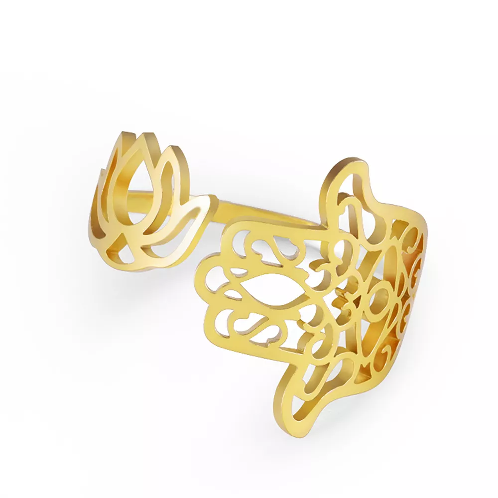 The Hamsa Hand, a revered symbol in various cultures, represents divine protection and spiritual strength. Known for its powerful connection to warding off the Evil Eye, this symbol has deep roots in the Middle East and North Africa. With influences from Jewish, Christian, Islamic, and even Pagan traditions, the Hamsa Hand also symbolizes fertility, good fortune, and blessings. Paired with the delicate lotus flower, which represents purity and spiritual enlightenment, this ring serves as a meaningful talisman to protect and inspire its wearer.
