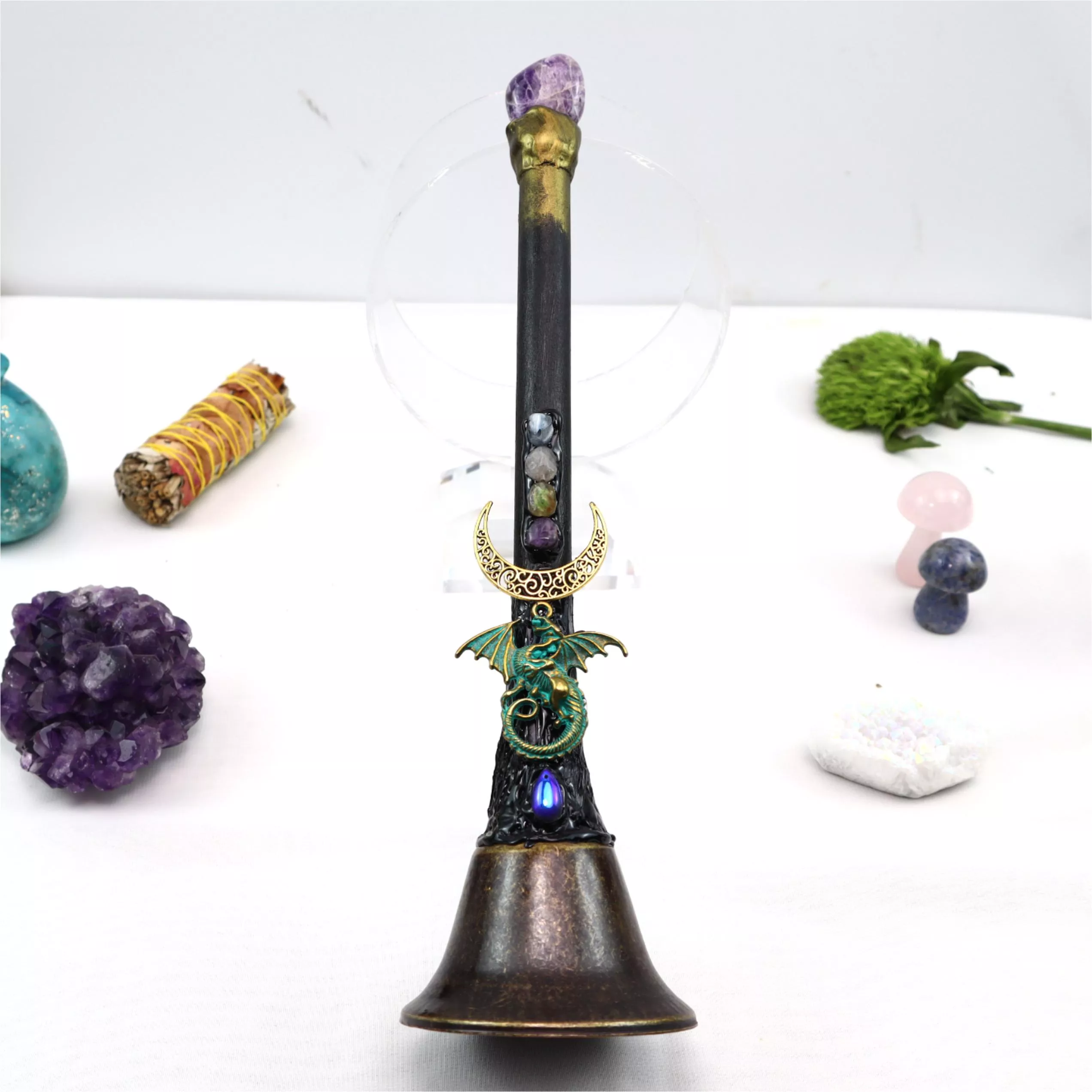 Large Witch Bell with Natural Crystal – Wiccan Altar Decor & Halloween Charm