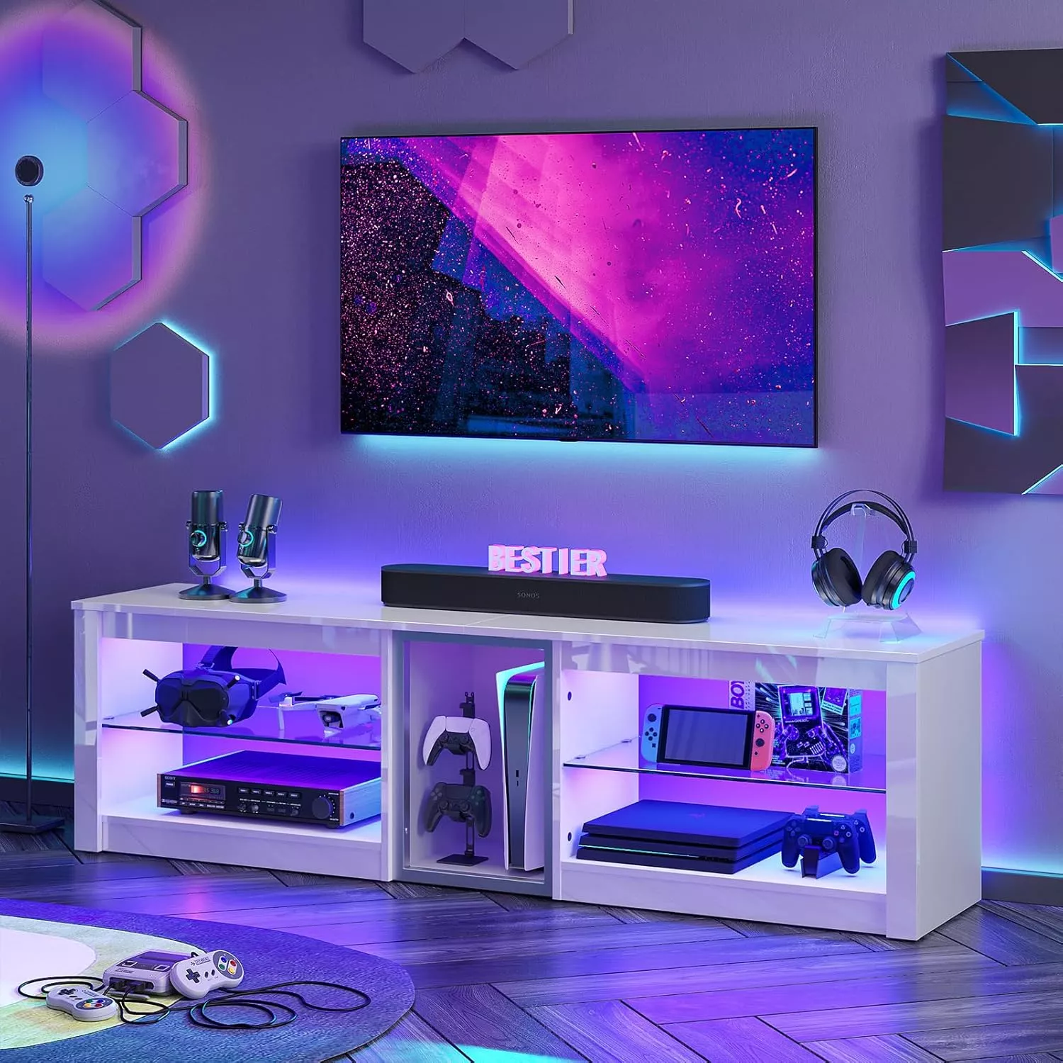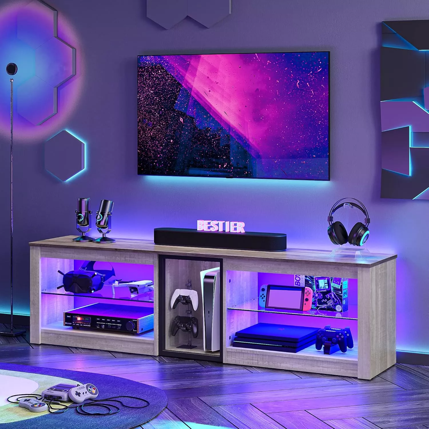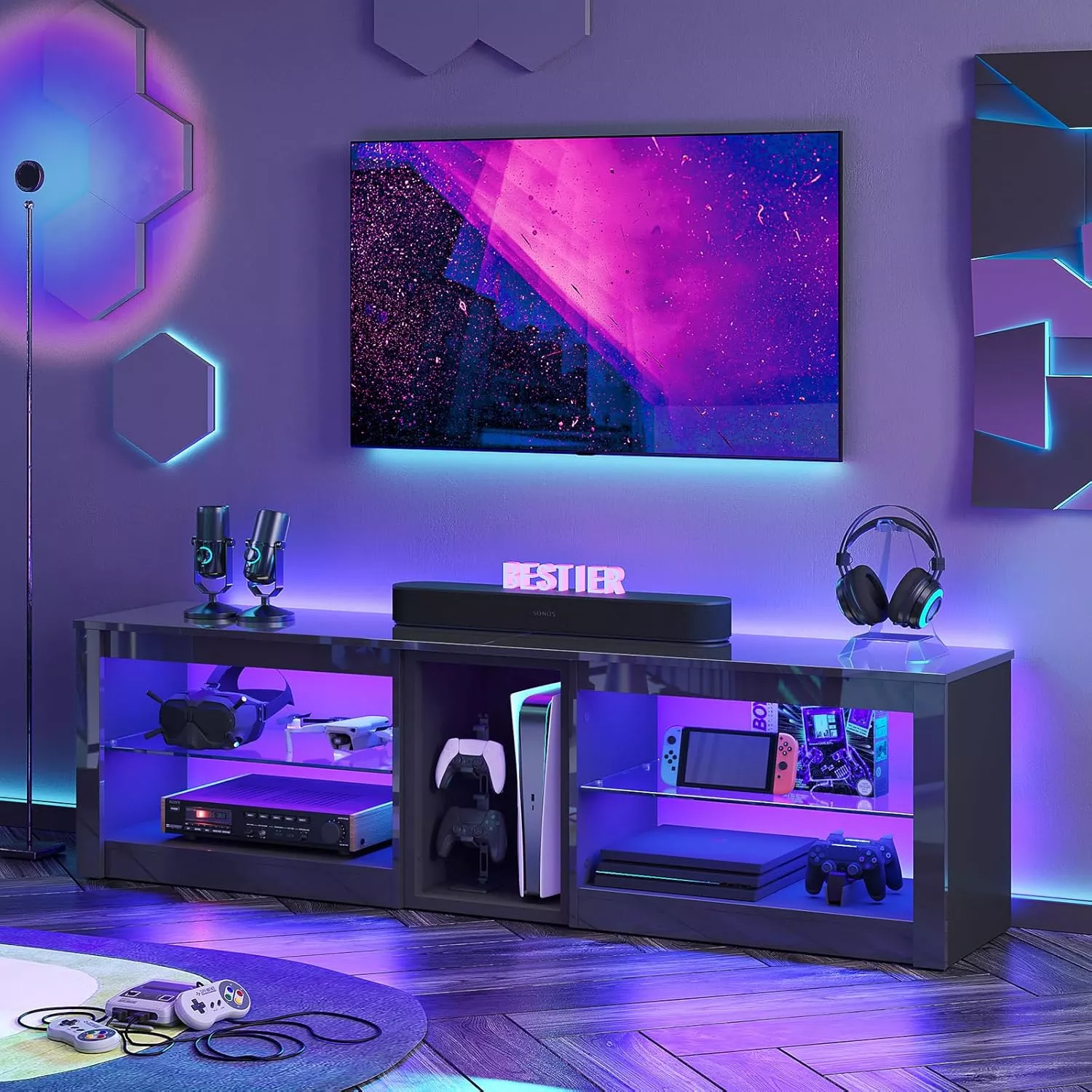 • Tempered Glass Shelves: Durable and stylish, perfect for displaying consoles and collectibles.