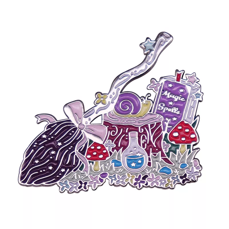 Magical Witch Broom Enamel Pin with Potion, Mushroom, and Snail Brooch