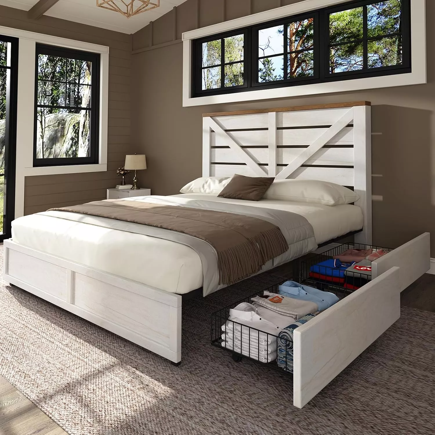 Bring timeless farmhouse style and smart functionality to your bedroom with this Queen Size Farmhouse Bed Frame. Designed to impress and built to last, this bed frame features a warm white and barnwood finish that creates a cozy, rustic atmosphere in any space. The barn-style headboard with arrow detailing adds a touch of vintage flair, while the sturdy construction ensures lasting support and stability. Whether you’re upgrading your master bedroom or furnishing a guest room, this bed is a stylish and space-saving solution.
