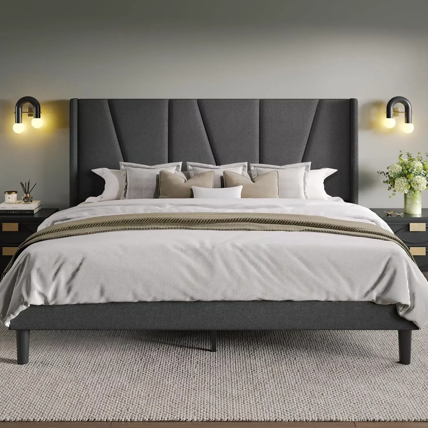 Bring both style and comfort to your bedroom with this Queen Size Platform Bed. Designed to impress, this bed features a stunning geometric wingback headboard that is sure to be the focal point of your space. Wrapped in breathable linen-inspired fabric, the bed offers a soft and comfortable touch while adding sophistication and modern elegance to your room.