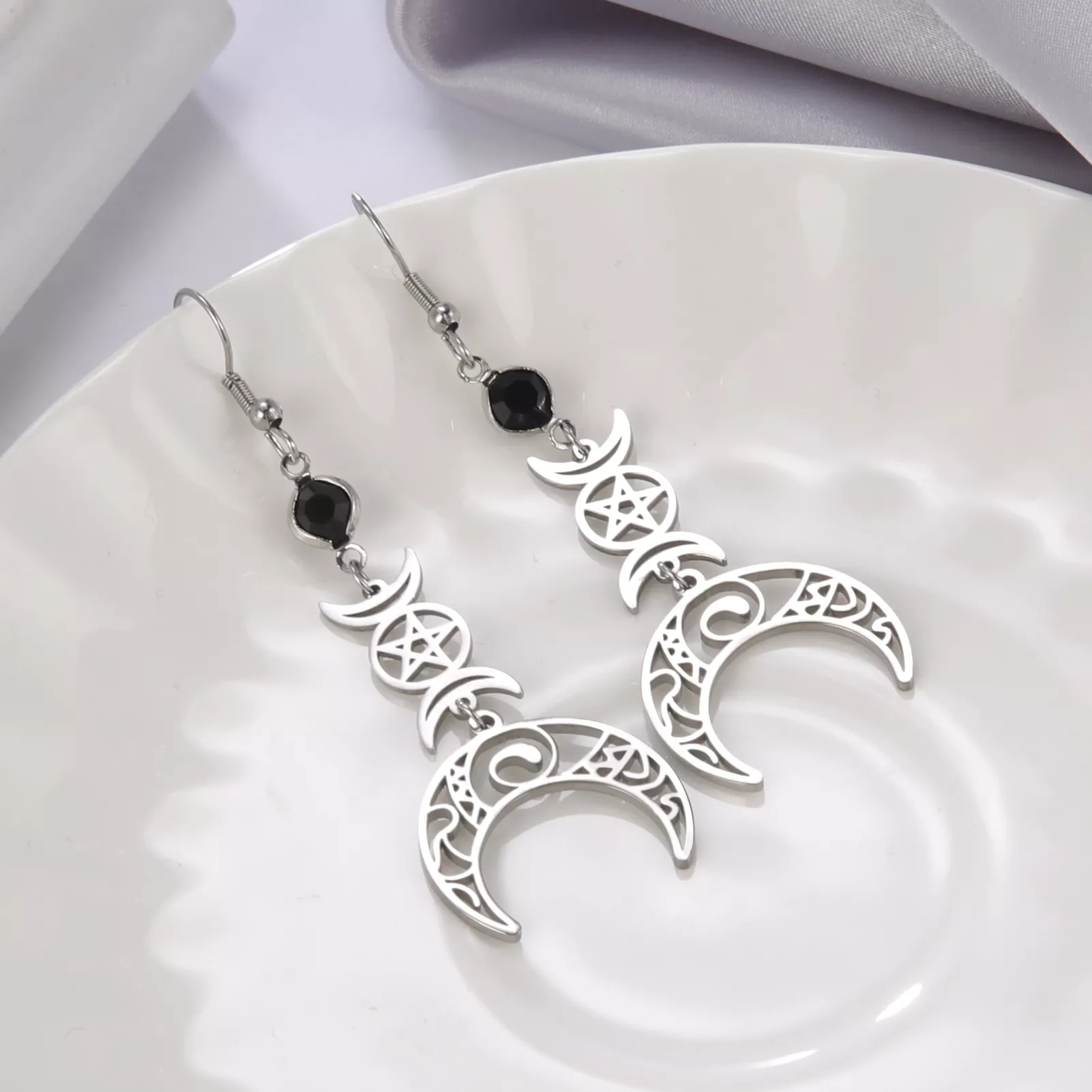 Triple Moon Pentagram Crescent Goddess Black Birthstone Gothic Drop Earrings